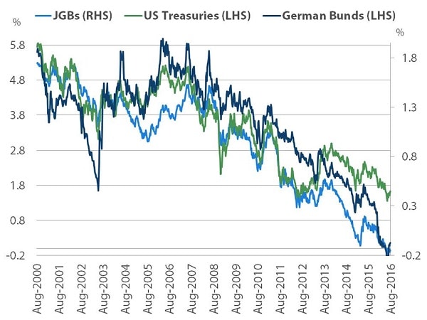 Chart 1: 10-year JGB, Treasury and Bund yields
